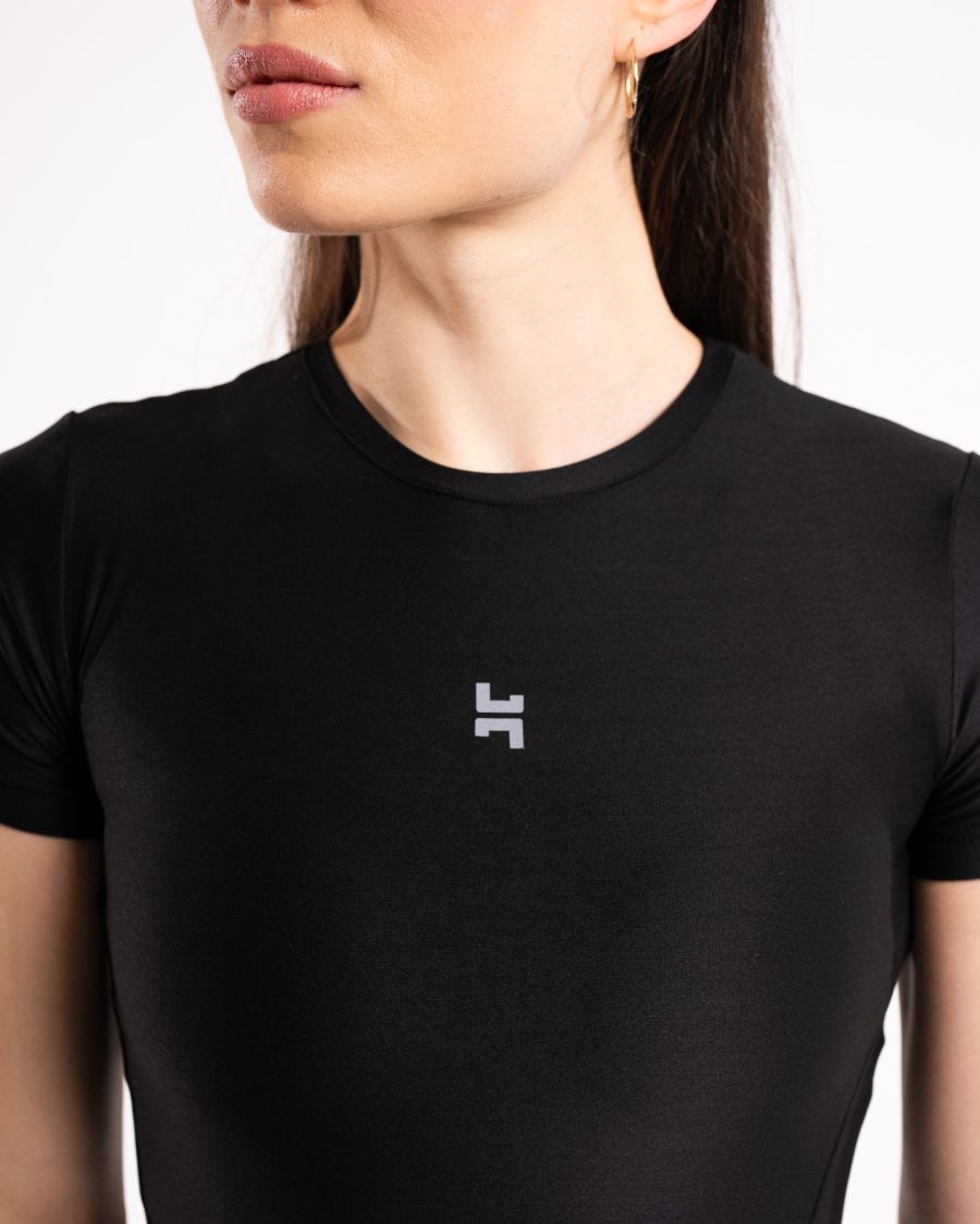 • Damska koszulka sportowa z krótkim rękawem w kolorze czarnym
